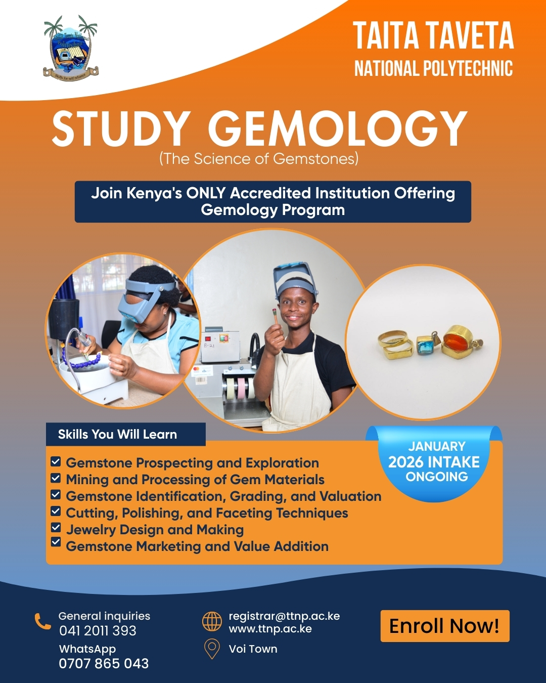 The history of Taita Taveta National Polytechnic dates back to 1981 when a group of ten visionary leaders from Taita raised funds to purchase a 42 Acre piece of prime land from African Tourism Development Company Limited for the purpose of starting an institute of technology. It is established in a dynamic education zone in Voi in the coastal mainland, a historic area where the oldest missionary church in Kenya was first built.